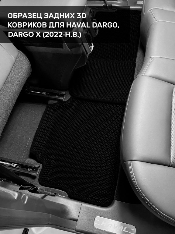 Автомобильные 3д коврики для Haval Dargo (2022-н.в.) в салон авто и багажник сделаны из инновационного полимерного материала EVA, изысканная структура в виде ячеек не дает воде, пыли и снегу разлетаться по салону машины и багажнику. 3д коврики зафиксированы на полу определенными клипсами, соответствующими Haval Dargo (2022-н.в.), и не двигаются в процессе езды.